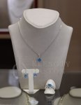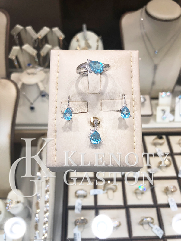 Elegantní souprava v bílém čtrnáctikarátovém zlatě. Krásně propracovaná souprava osazená světle modrým topazem, který je dále zdobený kulatými bílými brilianty. Tato kombinace dodává soupravě atraktivní vzhled. Soupravu tvoří zlaté náušnice, prsten a přívěs. Náušnice mají výšku 16 mm a klasické patentové zapínání. Doprava zdarma, dárková krabička a certifikát pravosti jsou samozřejmostí. Jednotlivé šperky lze zakoupit i samostatně. (řetízek není součástí soupravy)