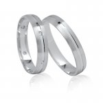 Snubní prsten z bílého zlata s lesklou drážkou po celém obvodu Vám jistě bude skvělým společníkem do manželství. Také šest blýskavých kamenů rozmístěných strategicky po dámském snubním prstenu nenechá nikoho chladným.